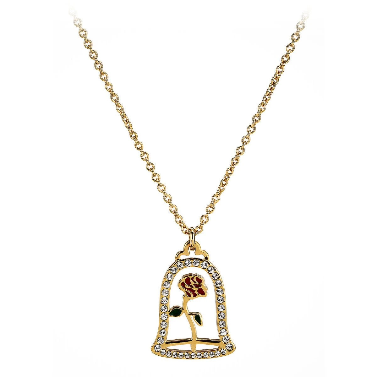 Dazzling Swarovski crystals encase the enameled enchanted rose on this elegant pendant inspired by Beauty and the Beast. Crafted in brass and plated in 14 kt gold by Arribas Brothers, this necklace will add fairytale charm to your look.