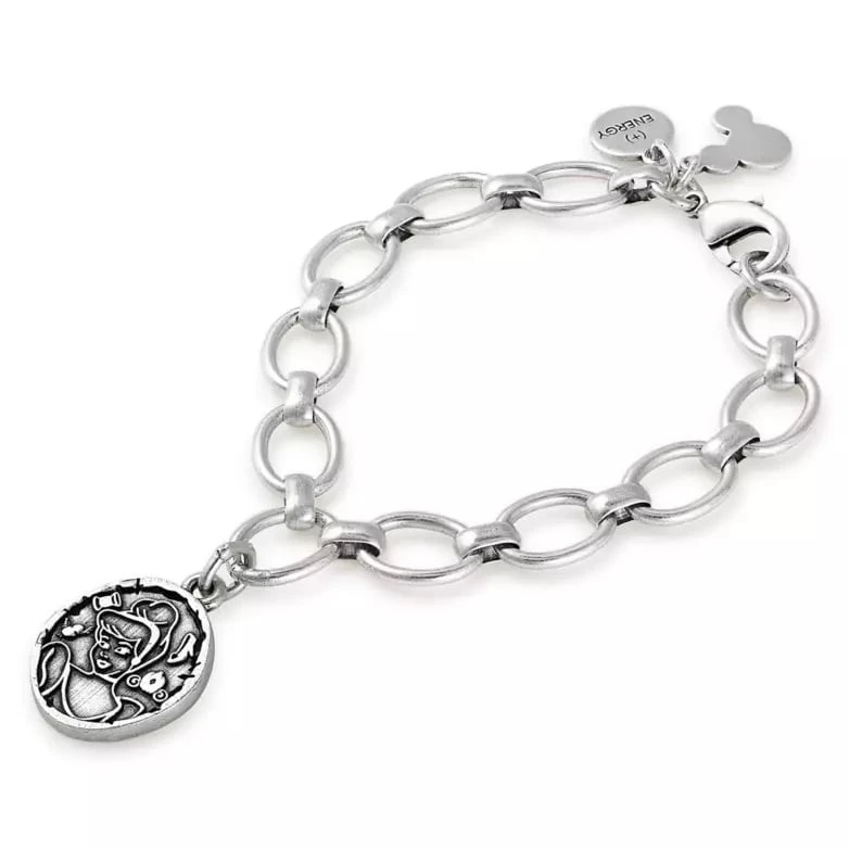 Celebrate the passion of Cinderella, rags-to-riches dreamer, with this chain link bracelet featuring a Cinderella portrait coin pendant, plus (+) Energy and Mickey Mouse icon charms, all in brass with a silvertone finish.