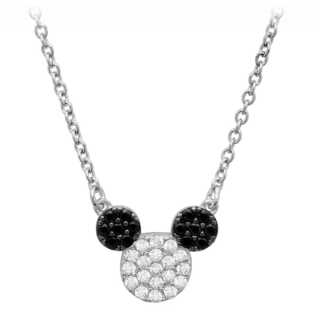 Mickey’s iconic likeness is formed in handset flawless black and clear cubic zirconia on this gorgeous necklace. Crafted from sterling silver and finished in pure platinum, this stylish keepsake is a sparkling reminder of your trip to the Park.