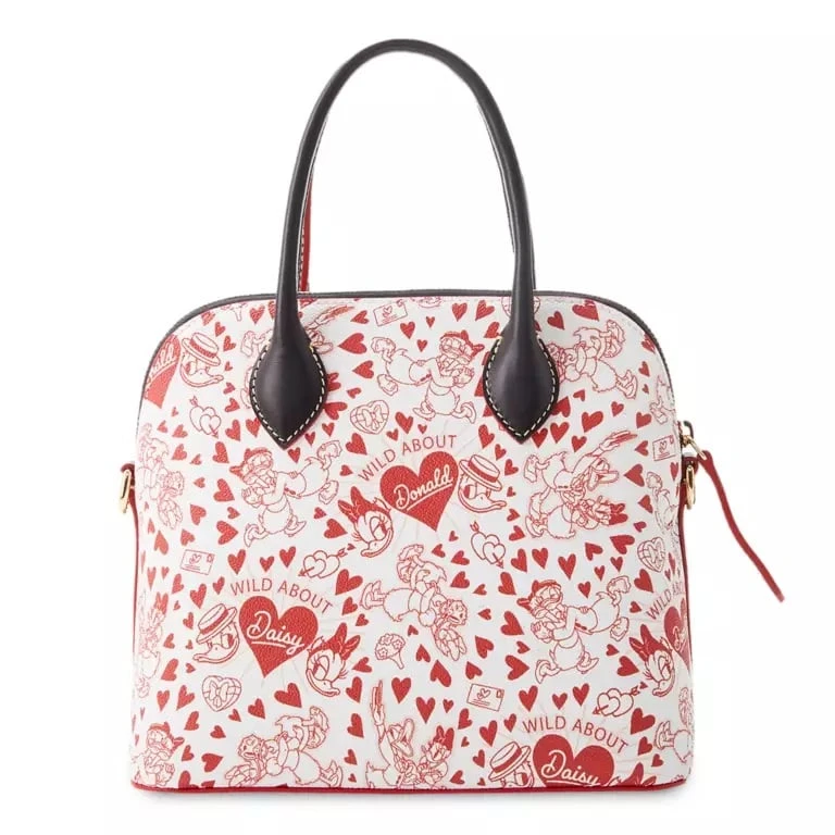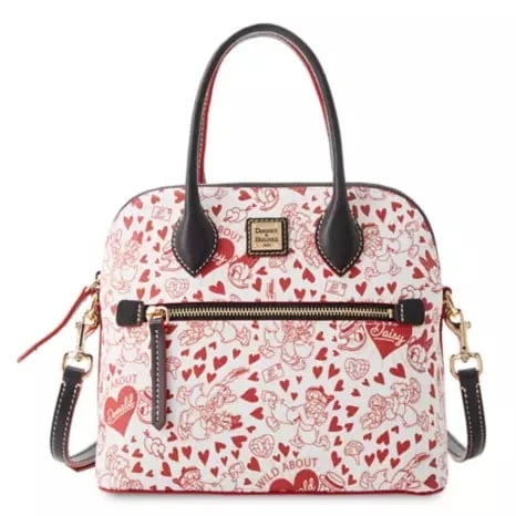 Birds of a feather stick together, especially when they’re ”wild about” each other like Donald and Daisy. The loving couple is featured surrounded by hearts in the romantic allover design of this simulated leather satchel from Dooney & Bourke.