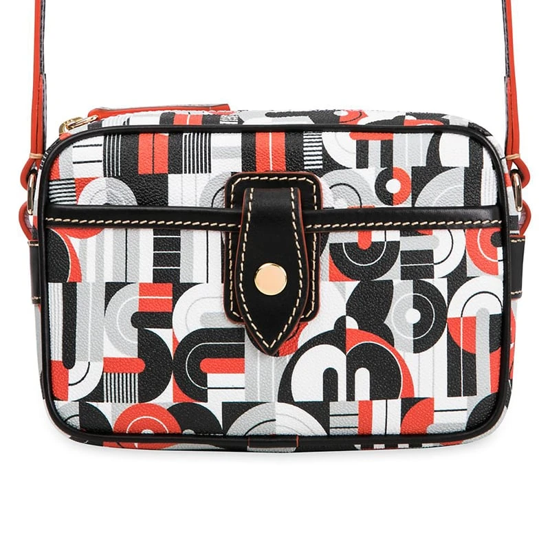 Shape things up when you accent your outfit with this accessory inspired by old school camera bags and designed by Tyler Dumas for Disney and Dooney & Bourke. Mickey and Minnie appear in the bold pattern of this slim bag featuring an adjustable crossbody strap.