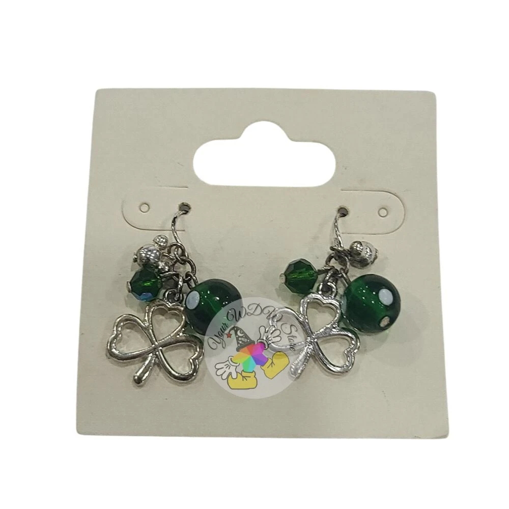 This beautiful set of earrings is silver toned, and has green beads, along with a clover, and a Mickey icon.