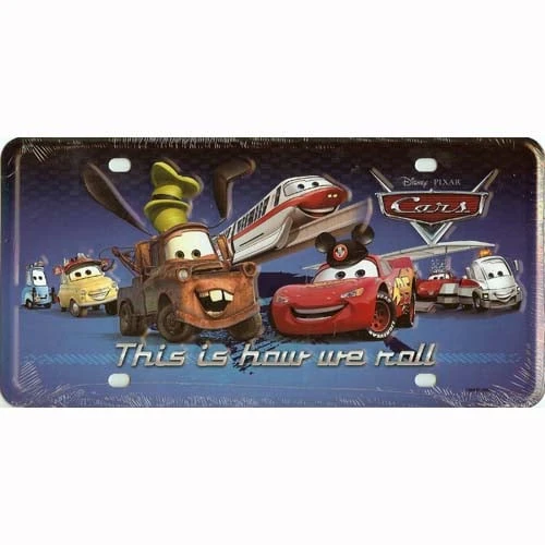 This metal Disney Pixar license plate features Lightning McQueen is wearing a Mickey ears hat, Tow Mater is wearing a Goofy hat, Luigi and Guido are pin traders, and Mia as a Princess is riding Disney’s signature tram. Also included is the Disney Monorail. Below the characters are the words “This Is How We Roll”.