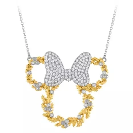 Minnie’s classic silhouette is decorated with goldtone snowflakes and sparkling cubic zirconia stones. Designed by Rebecca Hook, this sterling silver necklace is topped off with a dazzling bow for signature Minnie style.
