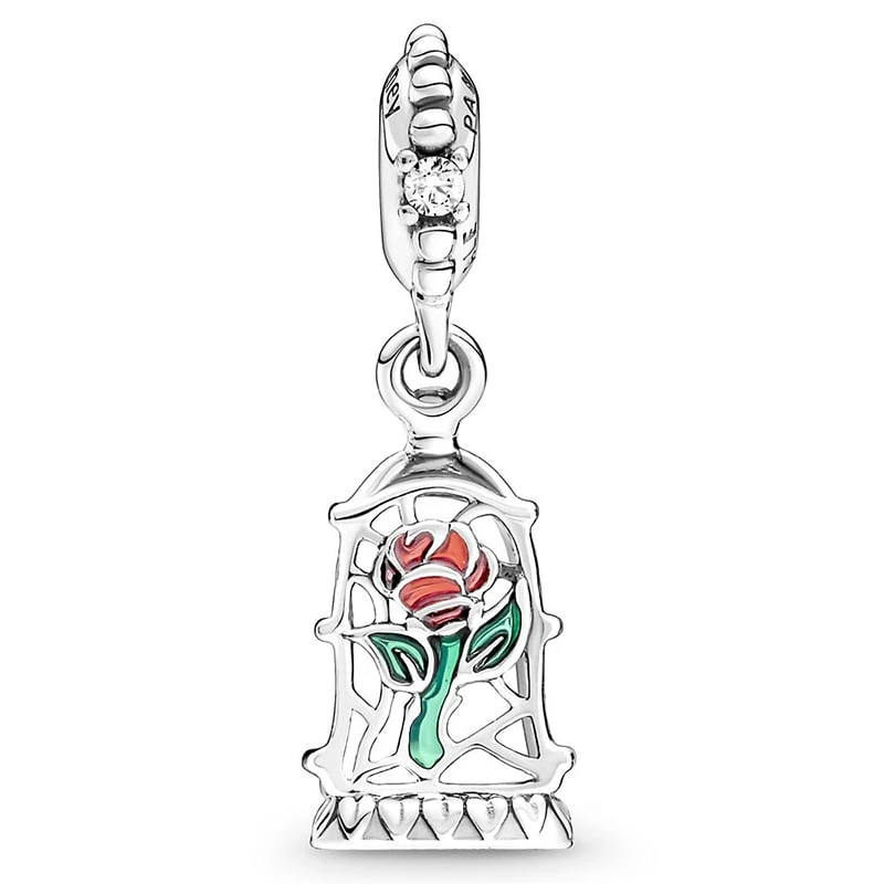 Relive a tale as old as time with this Enchanted Rose charm inspired by Disney’s beloved Beauty and the Beast. Fashioned in sterling silver by Pandora Jewelry, the filigree bell jar design is detailed with red and green enamel while the bead is accented with sparkling cubic zirconia.