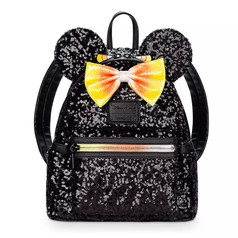 You’ll be treated to a bag full of compliments when you wear Loungefly’s compact black sequin Minnie Mouse mini backpack with candy corn-colored zipper and zipper pulls. The Mickey jack-o’-lantern lining only sweetens the style.