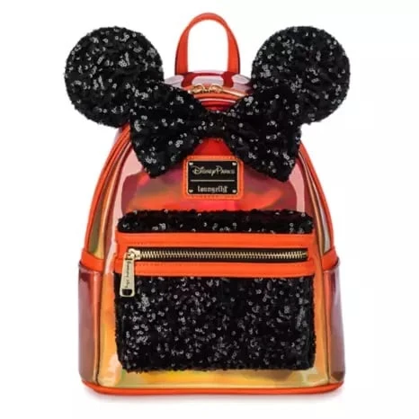 Minnie fans will take a shine to this glamorous mini backpack from Loungefly. The iridescent glossy vinyl shell has a two-tone orange and yellow appearance depending on how it catches the light. This contrasts dramatically with the black sequins on the 3D ears, bow and front pocket, creating a frightfully fashionable bag with a haunting Halloween color scheme.