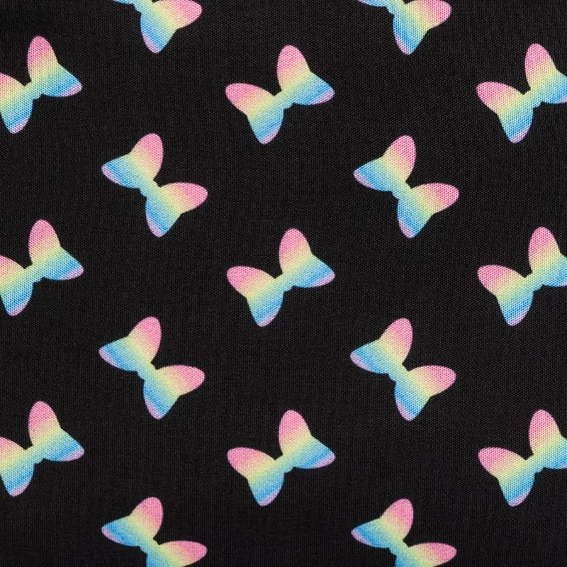 Minnie’s ears and bow are ever in style on this metallic simulated leather wristlet with a pastel rainbow sequined bow and pouch pocket. ”Mini backpack” styling with a whimsical flair make this clutch sparkle in more ways than one.