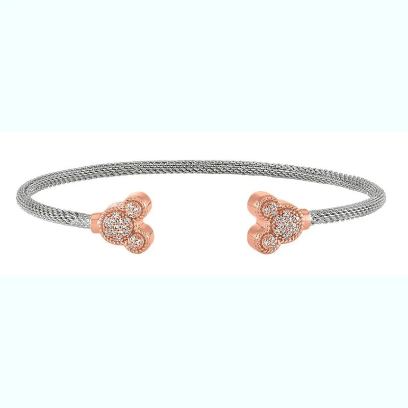 Be a style icon, just like Mickey, when you add this dazzling sterling silver bracelet to your look. With rose gold-plated Mickey icons on the ends, and glittering cubic zirconia, this bangle by designer Rebecca Hook will top your wrist list.
