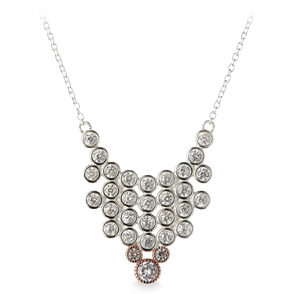 A breathtaking rhinestone cluster tapers down to a faceted ”hidden Mickey” gem setting on this bejeweled pendant with a sterling silver link chain necklace.