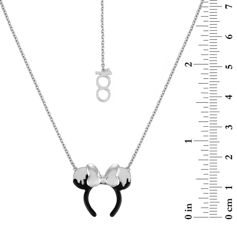 One of your favorite Disney Parks souvenirs becomes a timeless treasure with this Minnie Mouse ears headband sterling silver necklace by Rebecca Hook. Created by the beloved designer, it features a ”100” tag that hangs from a back drop chain. Platinum plated with matte black enamel detailing, this necklace is at once whimsical and timeless, gorgeous and adorable, just like the person who will be wearing it.