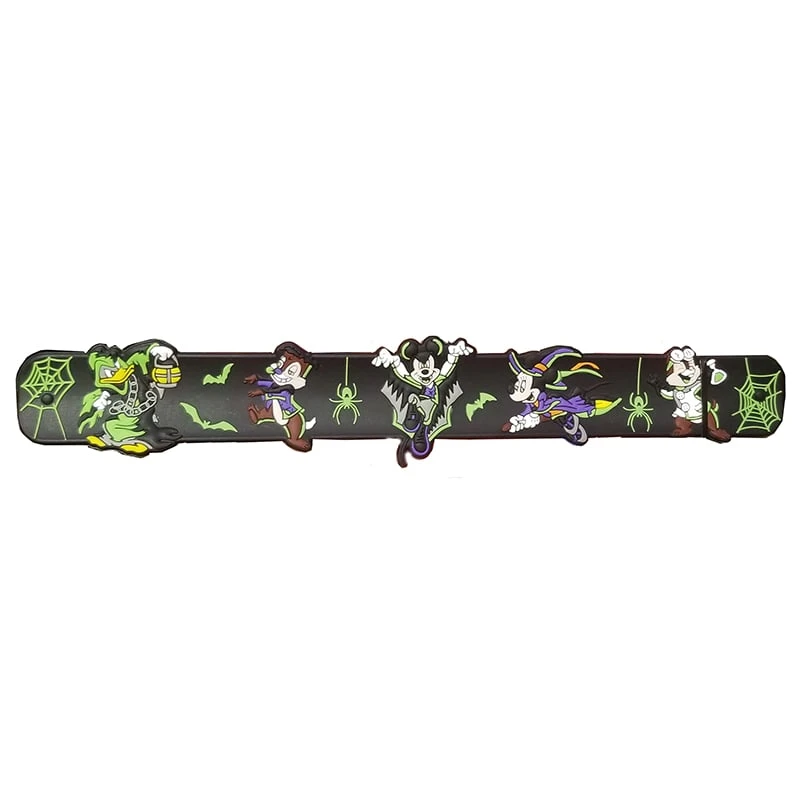 Wrap your wrist in Disney Magic with this Halloween Slap Band from Walt Disney World. Featuring Mickey and Minnie Mouse, Donald Duck, and Chip n Dale decked all spooky and decked out for Halloween on one side, and “Are you scared of the parks” text on the other, this glow-in-the-dark band can even be seen at night.