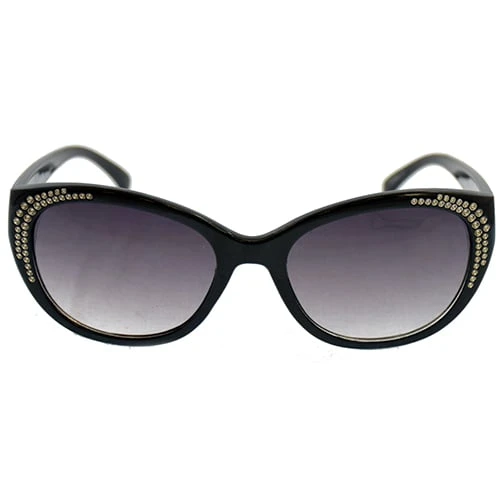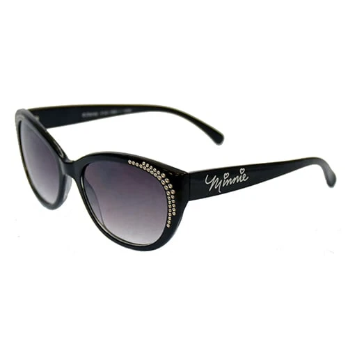 Minnie looks at things in a new light with these sunglasses. The black plastic frames feature the Minnie signature on the outside arms and the top corners of the frames shine with the bling.