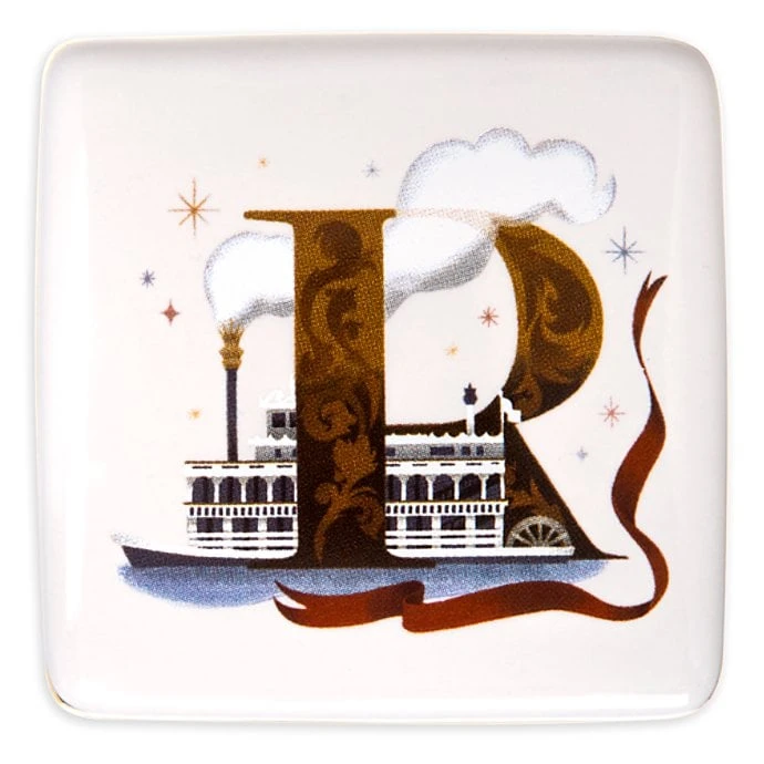 R is for the Riverboats on this trinket dish that will look perfect docked on your dresser or desk. The gold edged ceramic decor item features exterior and interior designs inspired by the Riverboats of the Disney Parks that paddle around the past while cruising along on scenic tours.