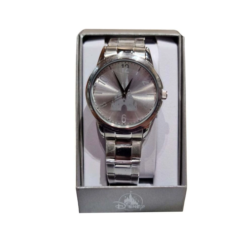 Crafted in a sleek stainless steel design, this elegant timepiece features a silver tone Cinderella Castle on the silver face.