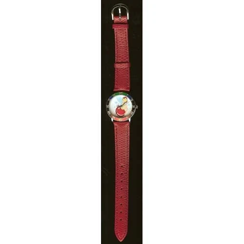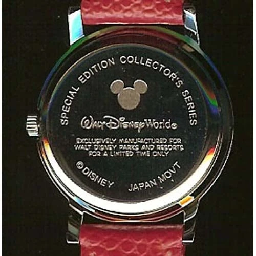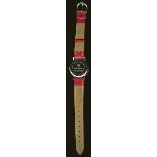 This is a Time Works Watch featuring Tinker Bell. Tinker Bell looks adorable posing on a Red ornament wearing her Santa Hat. The Red leather watch band adds to the holiday appeal of this fun watch. There are Roman Numerals etched into the silvertone case of the watch. The watch comes in the original plastic case. There is a silver sticker attached on the front of the case. It says: Special Edition Collector’s Series Walt Disney World Exclusively manufactured for Walt Disney Parks and Resorts for a limited time only. As you can see in one of the photos, this same information is on the back of the watch also. When measured from the tip of one end of the watch band to the end of the clasp it is approximately 8 1/2 inches. If measured from the last hole in the watch band to the end of the clasp it is approximately 7 3/4 inches.These watches are from 2006 and have been stored inside of the case in a plastic storage container. It is in excellent condition. The watch has been tested and it did run. However, you may still need a new battery because the watch has been stored for a few years so we will add in a new battery if available at time of shipment.