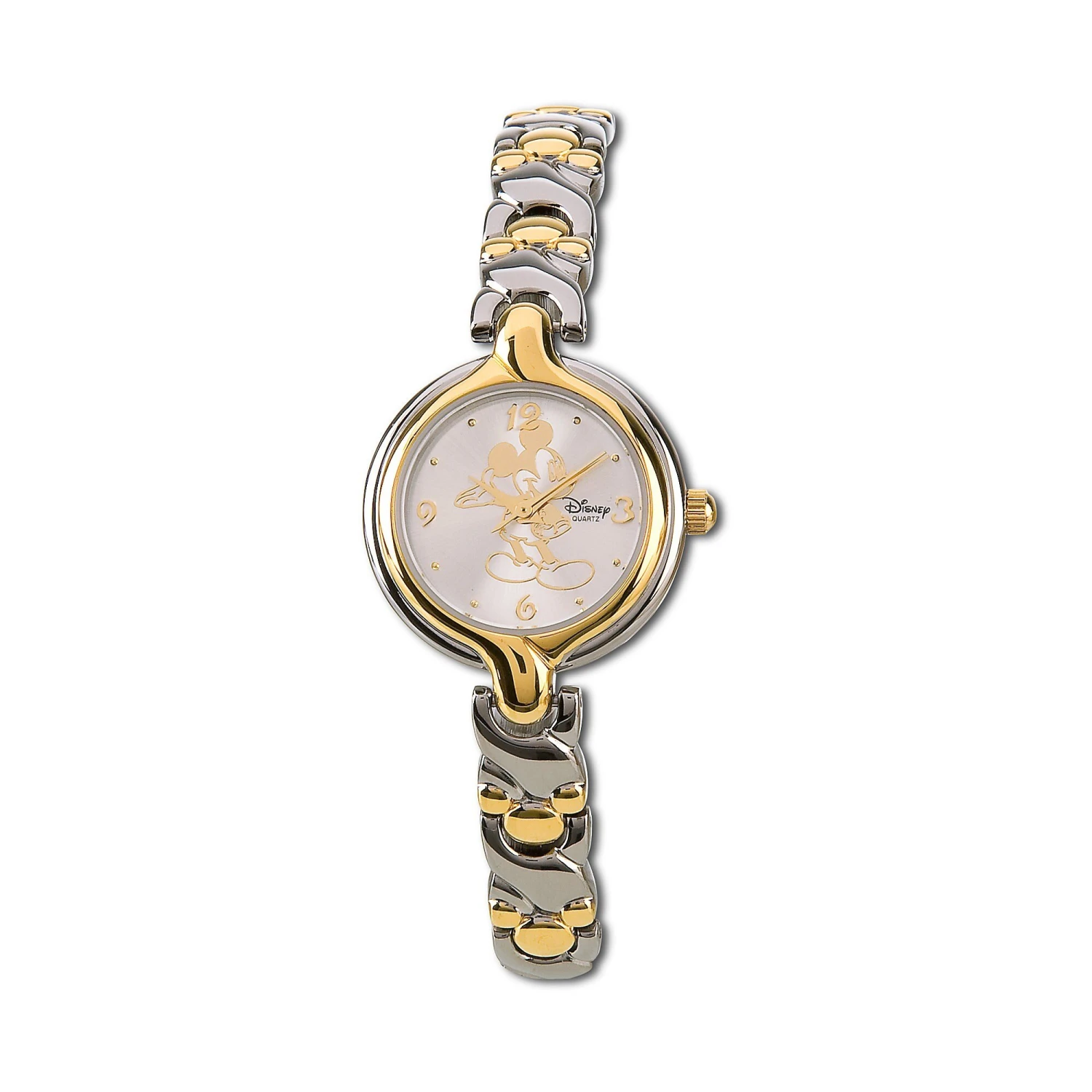 The biggest star is beaming brightly from this Mickey Mouse Watch for Women with Icon Links Band. The gleaming gold tone band with chrome trim and ”hidden Mickey” icon links adding fancy fun to any outfit!