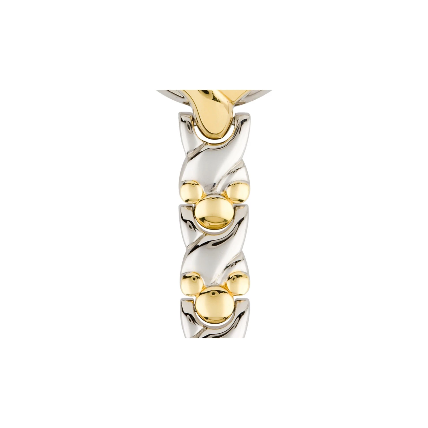 - Two-tone chrome and gold finish band with golden ”hidden Mickey” icon links and folding clasp